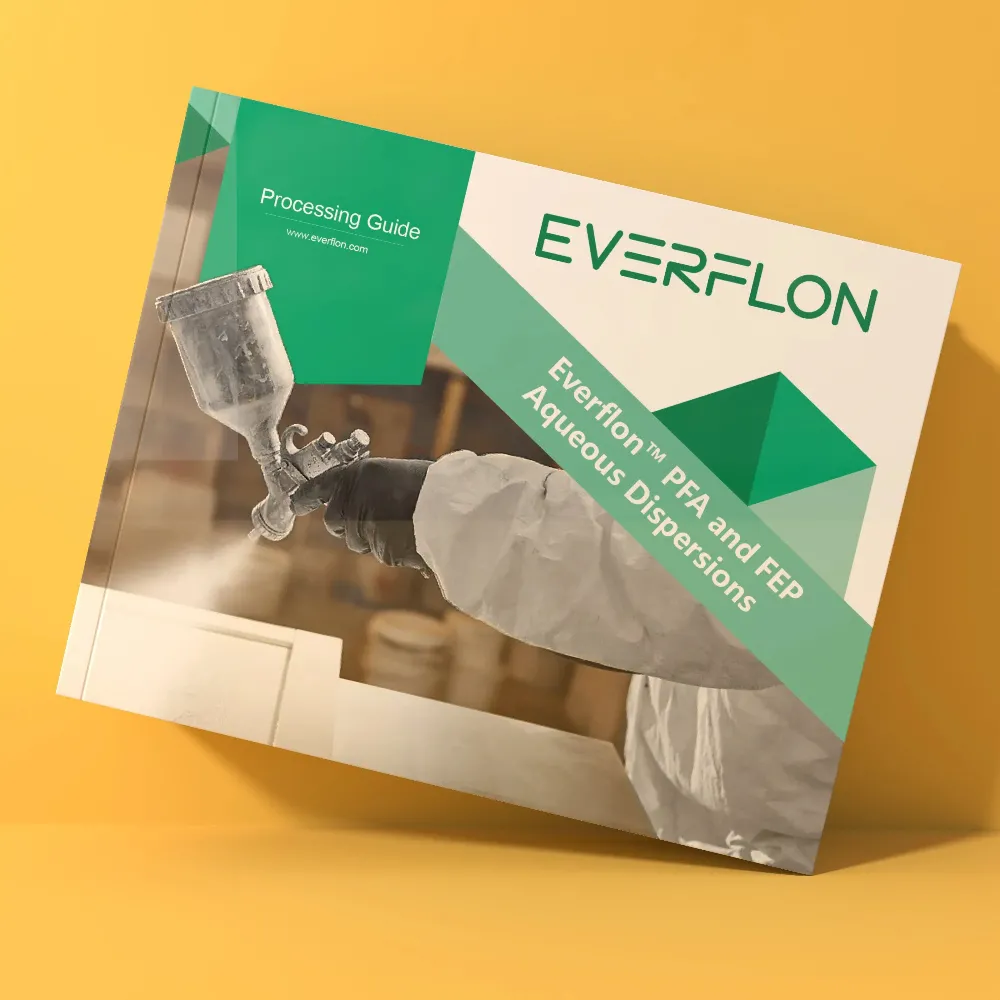 Conventional coating techniques, such as dip, spray, spin, or roller coating, can be used for coating or impregnating high temperature materials with Everflon™ PFA D450. Thin coats, usually less than 5 μm (0.2 mil), are applied to prevent mud cracking as the coating dries. The water is normally removed at 120 °C [250 °F], followed by heating to remove the wetting agent (typically at 250–270 °C [482–518 °F]). Final consolidation is done above the 305 °C (581 °F) melt point. If the Everflon™ PFA D450 is being used as a top coat over a PTFE coated fabric or other parts, the coating must be heated to melt the PTFE (approximately 337 °C [639 °F]) to maximize adhesion. Prolonged heating above 370 °C (698 °F) should be avoided, as this could lead to thermal degradation of the Everflon™ PFA D450 polymer.