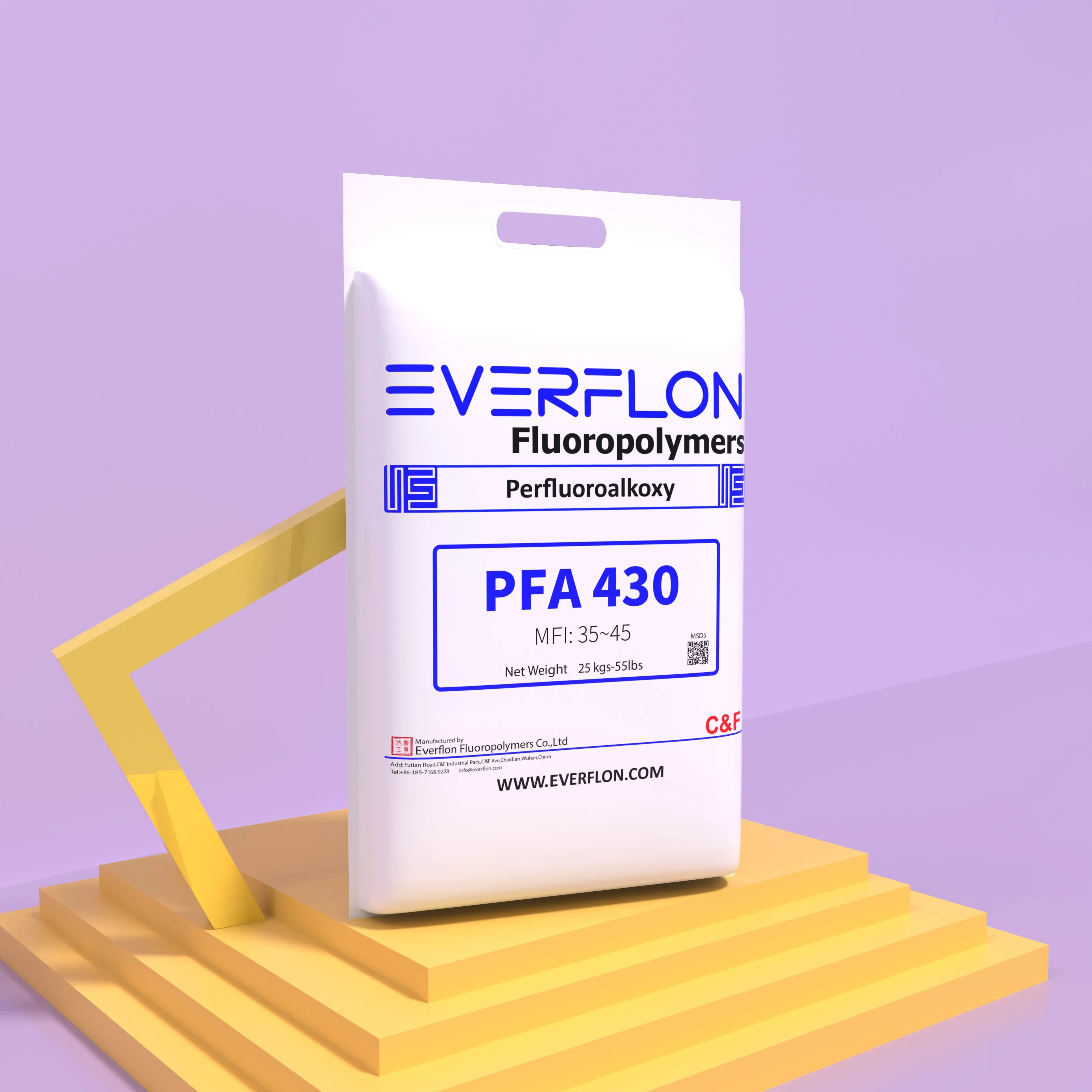 Everflon™ PFA 樹脂的性能不受儲存時間的影響。環境儲存條件應避免空氣污染以及從容器取出樹脂時樹脂表面出現水汽凝結。 Everflon™ PFA 以顆粒形式供應,採用 25 公斤多層包裝,內含聚乙烯內襯。
